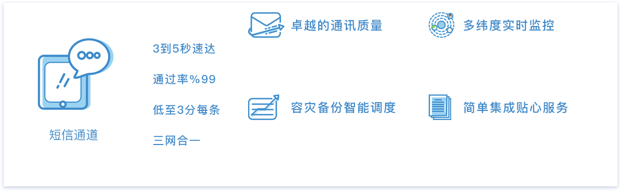 文档完善,最快10分钟接入,1小时上线;并提供短信上下行状态,失败原因分析等一系列分析报表。